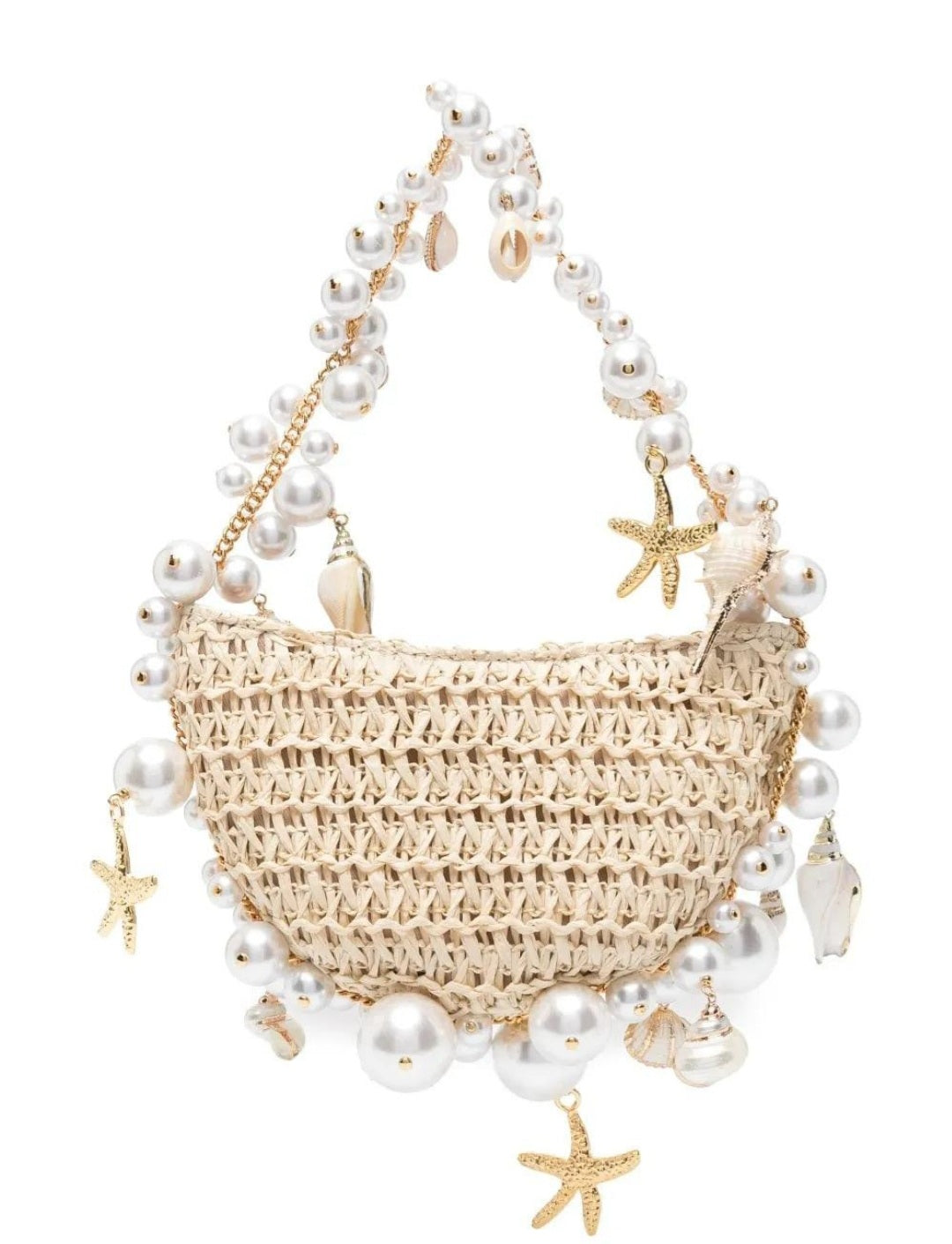Com pingentes de pérolas, estrelas e conchas do mar;